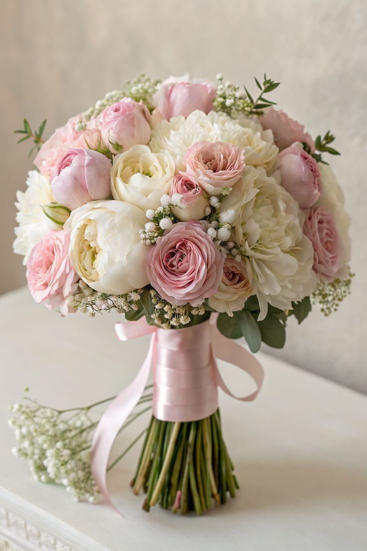 Hoa cưới cầm tay Blush Harmony mang vẻ đẹp dịu dàng và lãng mạn, nổi bật với sự kết hợp hài hòa giữa hoa hồng phấn, hoa mẫu đơn trắng và baby trắng tinh khôi. Gam màu pastel nhẹ nhàng tạo cảm giác trong trẻo, nữ tính, giúp cô dâu tỏa sáng theo cách tự nhiên và tinh tế nhất trong ngày trọng đại.